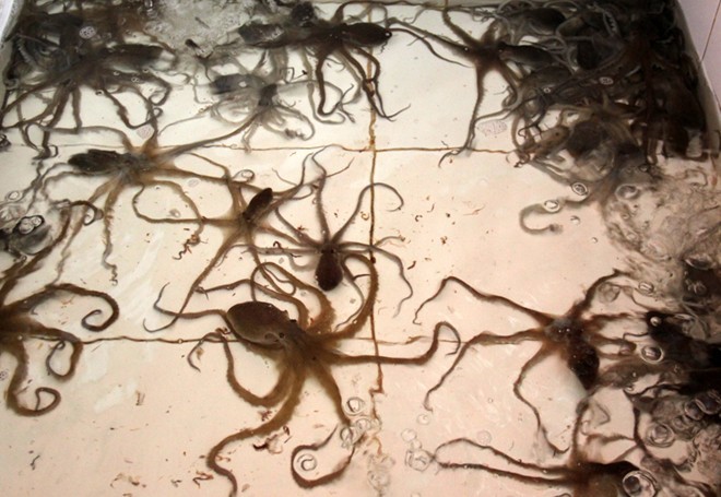 Bạch tuộc tươi sống có thân to bằng ngón chân cái giá 350.000 đồng/kg tại nhà hàng. Các vựa ven cửa biển bán 250.000 đồng/kg.